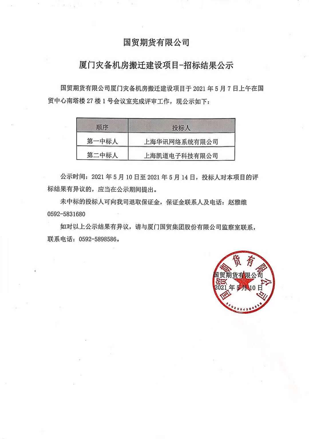 国贸期货厦门灾备机房搬迁建设项目招标结果公示