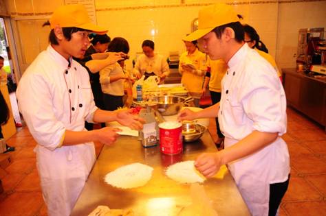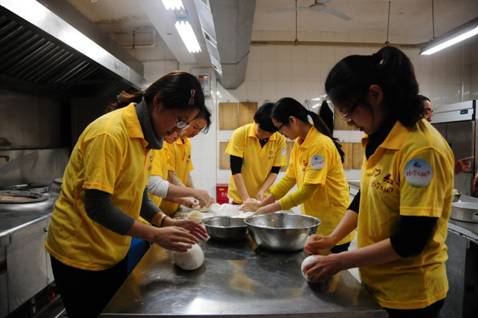 本次比赛吸引了众多美食爱好者参加,他们分成两队,一队跟随特教学校的老师和学生学习制作比萨、蛋糕、饼干等西点,另一队跟随国贸集团烹饪俱乐部的“老师”学习制作四喜饺子、水晶饺等中式点心。特教学校和国贸集团的“老师”们分别介绍了制作要点后,大家就开始分头动手制作各式美食了。