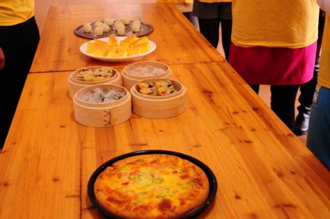 到了实践环节,学员们个个跃跃欲试,一开始粗糙的技术随着练习不断地进步,虽然无法与老师们比肩,也算是有模有样。不一会儿,饺子和包子便上笼开蒸,烤箱里传出蛋糕、饼干和披萨的香味,令人垂涎欲滴。